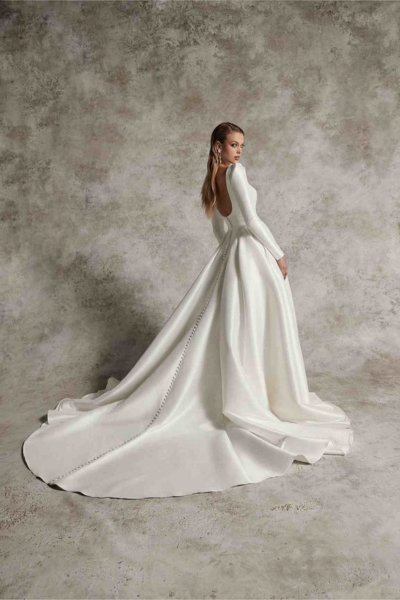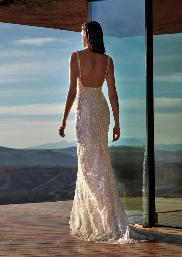 Rhodium by Pronovias Privée is a sophisticated beaded sheath with a square neckline and corset bodice. Its low square back and sweep train provide elegance with ease of movement. Best suited to brides seeking subtle glamour for contemporary or formal ceremonies, this gown balances classic tailoring with delicate, refined ornamentation.