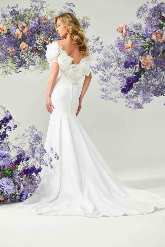 Shelby by Karen Willis Holmes embodies timeless beauty with a V-neckline, thick straps, and a fit-and-flare crepe silhouette. The elongated low back and gathered train highlight natural curves while offering elegance and comfort. This gown suits brides wanting effortless charm for both formal city weddings and scenic outdoor ceremonies.