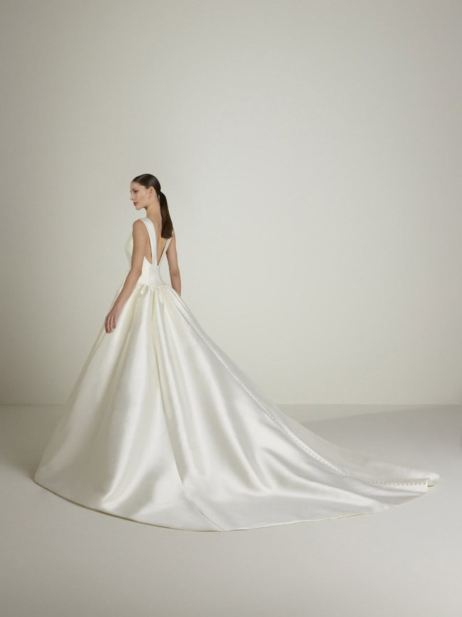 Another from Rosa Clara, Odin offers a sleek, straight two-piece silhouette in bi-stretch crepe, featuring a halter neckline, open back, and detachable drape. This contemporary gown is ideal for brides seeking sculptural elegance with versatility, perfect for minimalist or city-luxe ceremonies where style meets modern sophistication.
