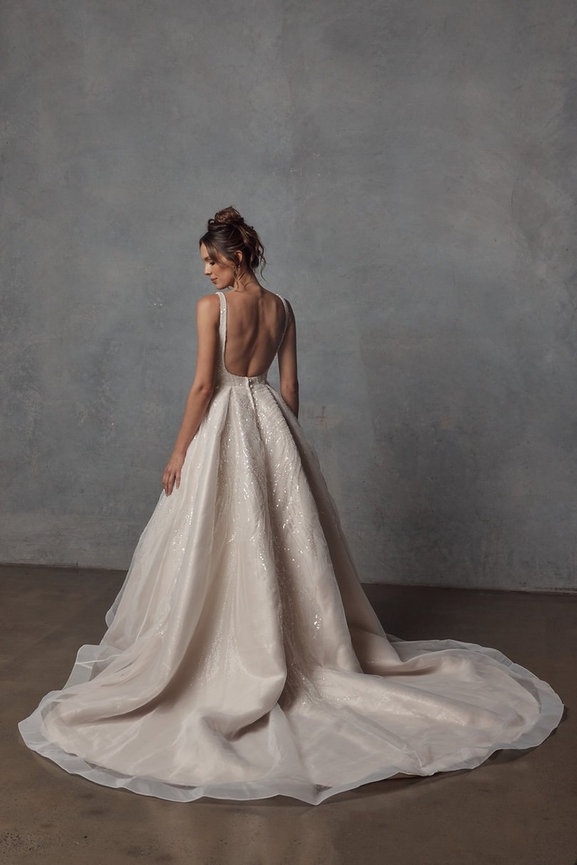 The Demi gown by Jack Sullivan combines classic ballgown structure with a low back and soft organza overlay. Subtle sequins shimmer under light, while gentle side mesh cutouts add comfort. Ideal for romantic church weddings or elegant evening receptions, Demi is a dreamy choice for brides seeking tradition with a hint of contemporary flair.