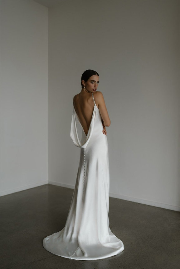 Harmony by Hera Couture is a timeless Italian crepe satin slip gown, flowing effortlessly over the body. Its low cowl back and delicate suspended drape above the tailbone create understated elegance, while pearl buttons add refinement. Perfect for a sophisticated city wedding or an intimate garden ceremony, this gown celebrates graceful femininity with subtle drama.