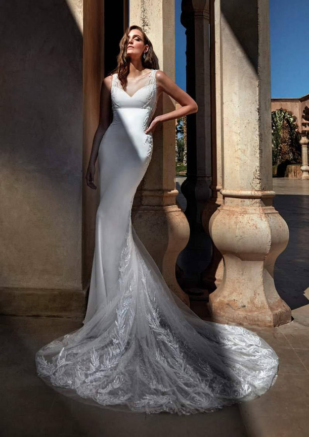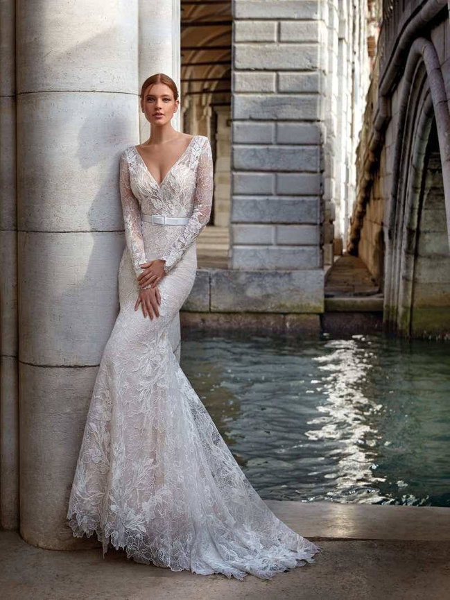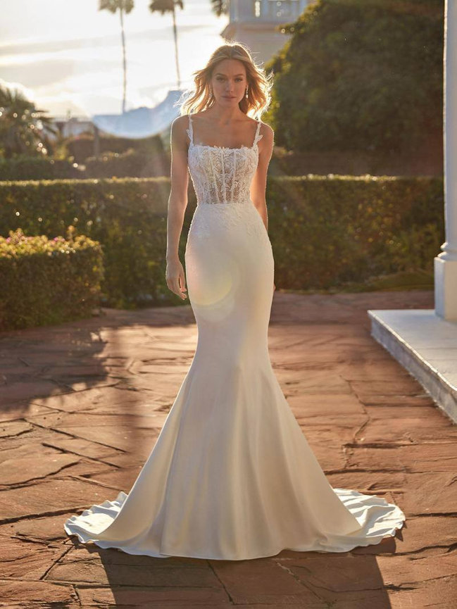 Arial, also from Pronovias, is a stunning mermaid-style dress that combines crepe, glitter, lace, and beads to create a luxurious and elegant look. The dress features a soft structure with standard cups for a comfortable fit, and it is fully lined.