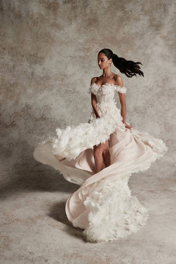 With an off-the-shoulder neckline and delicate 3D floral petals, the Virgil gown by Justin Alexander makes a bold statement. This A-line tulle dress features fluid movement, perfect for a bride looking to express her femininity and make an unforgettable entrance. The dramatic floral details and chapel-length train add an air of modern elegance you’ll fall in love with.