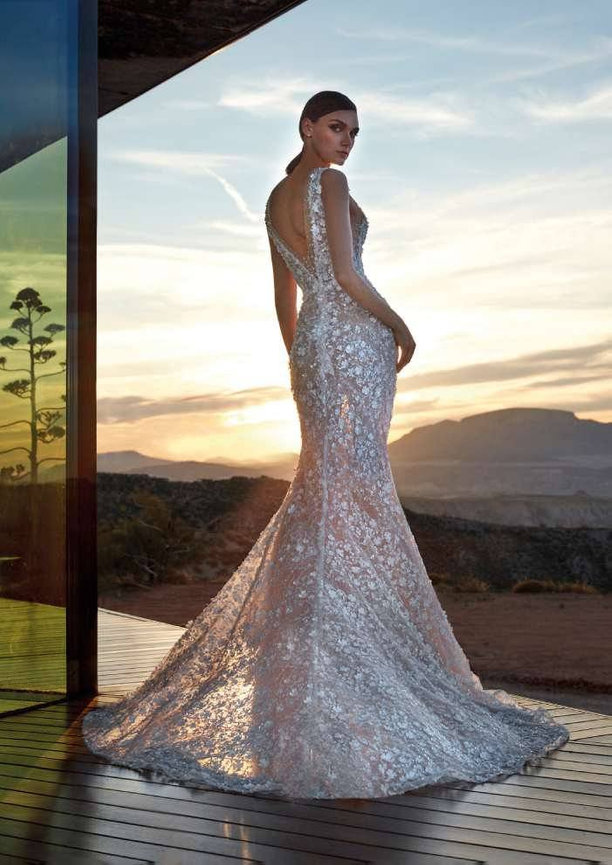 Designed for the confident bride, the Diamond gown by Pronovias Privee features a figure-hugging mermaid silhouette with a V-neck and intricate beadwork. This dress is adorned with floral elements, combining glamour with femininity in a stunning package.