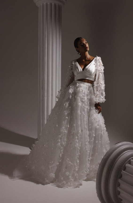 For the bride who wants to make a modern statement, the Matisse Two-Piece Set by Hera Couture offers a perfect combination of softness and drama. This floral wedding dress with sleeves is made of satin with soft gathers at the bust, and the 3D lace sleeves add a delicate touch. The full-length skirt, adorned with sequins and appliqué flowers, offers a dazzling, artistic look that’s as sophisticated as it is whimsical.
