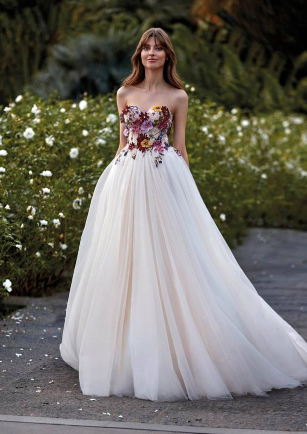 The Aqua gown by Nicole Milano brings a touch of whimsy with its princess-style silhouette and blush tulle skirt adorned with 3D lace flowers. This gown is perfect for a bride who dreams of a fairytale-inspired wedding with a unique twist.