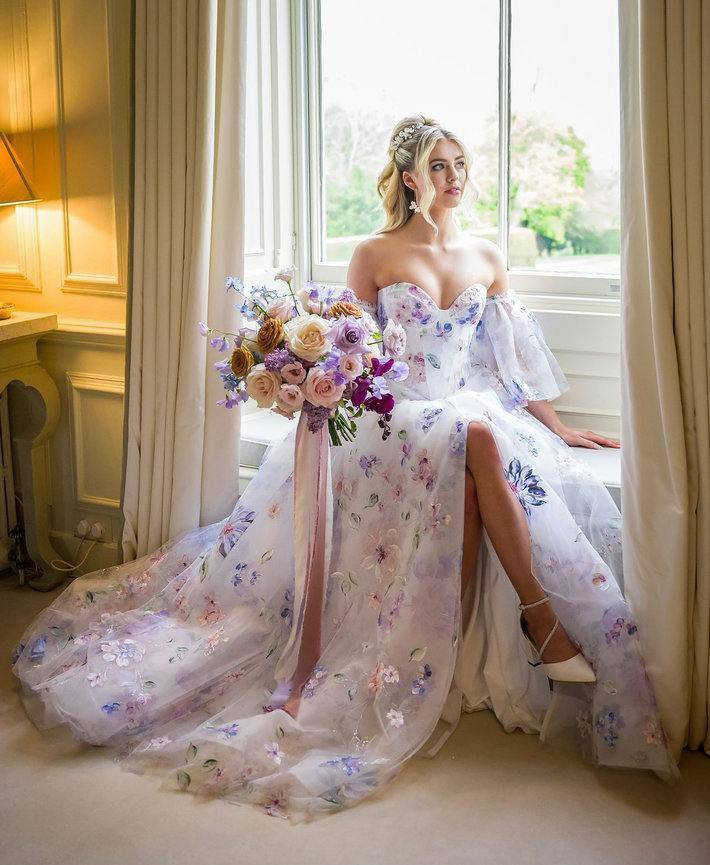 The Bloom gown from House of Savin blends classic bridal elegance with a burst of colour. Hand-painted with lilac, pink, green, and blue flowers, this wedding dress features a sweetheart neckline, a modern basque waist, and a corset back, culminating in a soft tulle skirt with a full train. Bloom is perfect for a dreamy garden wedding or a romantic celebration.