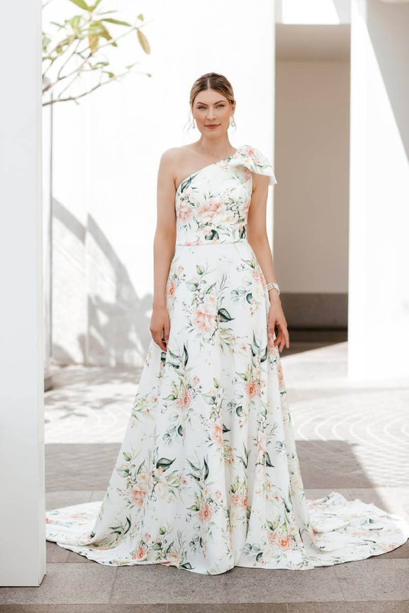 With its one-shoulder design and soft floral print, the Mia gown by Wendy Makin is perfect for a bride seeking a romantic outdoor celebration. The soft floral design is perfect for garden weddings or any event that embraces natural beauty.
